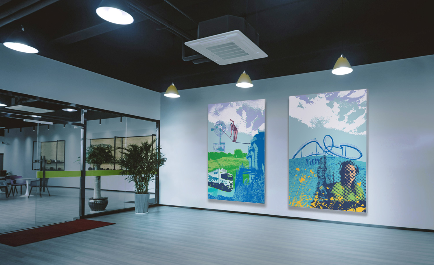 Als Unterstützung der Innenraumgestaltung des Foyers entstanden grafische Bildkompositionen, die neben den bildnerischen Andeutungen zum Unternehmen auch lokale Sehenswürdigkeiten aus der Umgebung der jeweiligen Standorte des Unternehmens zitieren. Die Foyers und teilweise Büros an verschiedenen Standorten verteilt in ganz Deutschland werden so mit grossformatigen und wertigen Bildwerken als Unterstützung der Corporate Identity gestaltet.