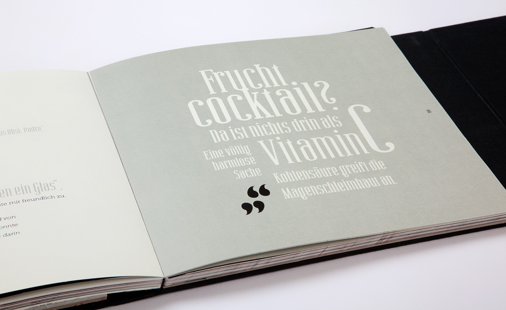 Für die Gestaltung werden zusätzliche Vorgaben festgelegt. Innerhalb des Buches sollen die Kapitel in verschiedenen Anmutungen gestaltet werden, die nur durch die Auswahl, Kombination und Gestaltung der Schriften erzeugt wird.
